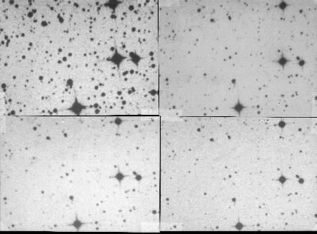 Figure 3a-d. A set of 4.4x3arcmin identical sky regions taken from near the field centre of 4 UKST exposures of standard galactic plane survey field 213. The top left image (figure 2a) is from the A-grade survey R plate taken with IIIaF emulsion and the OG590 R-band filter with 63mins exposure and a visual point source detection limit of R~21.5. The top right is from the equivalent exposure taken with Tech-Pan and the new H-alpha filter with 120mins exposure (figure 2b). The bottom left (figure 2c) is the short red A-grade survey plate taken with 098-04 fast but coarser grained emulsion with a narrower 630 red filter (600A) in 10minutes exposure whilst the bottom left (figure 2d) gives the A-grade `I' survey plate taken with IV-N emulsion with a 715 filter and 90minutes exposure.
